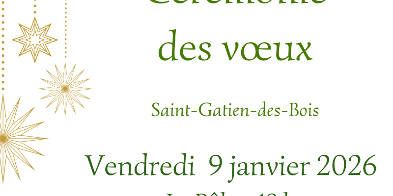 Monsieur Philippe LANGLOIS, Maire de Saint-Gatien-des-Bois vous invite à la cérémonie des voeux qui aura lieu vendredi 9 janvier 2026 à 19 heures dans la salle des fêtes Le Pôle, 16 chemin du Reux.